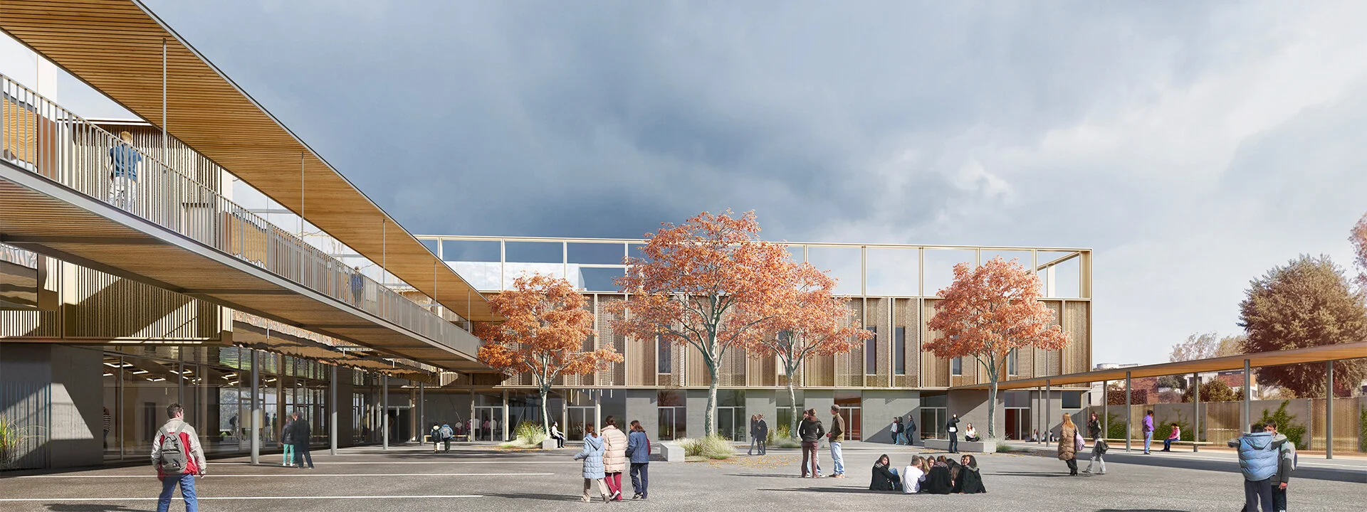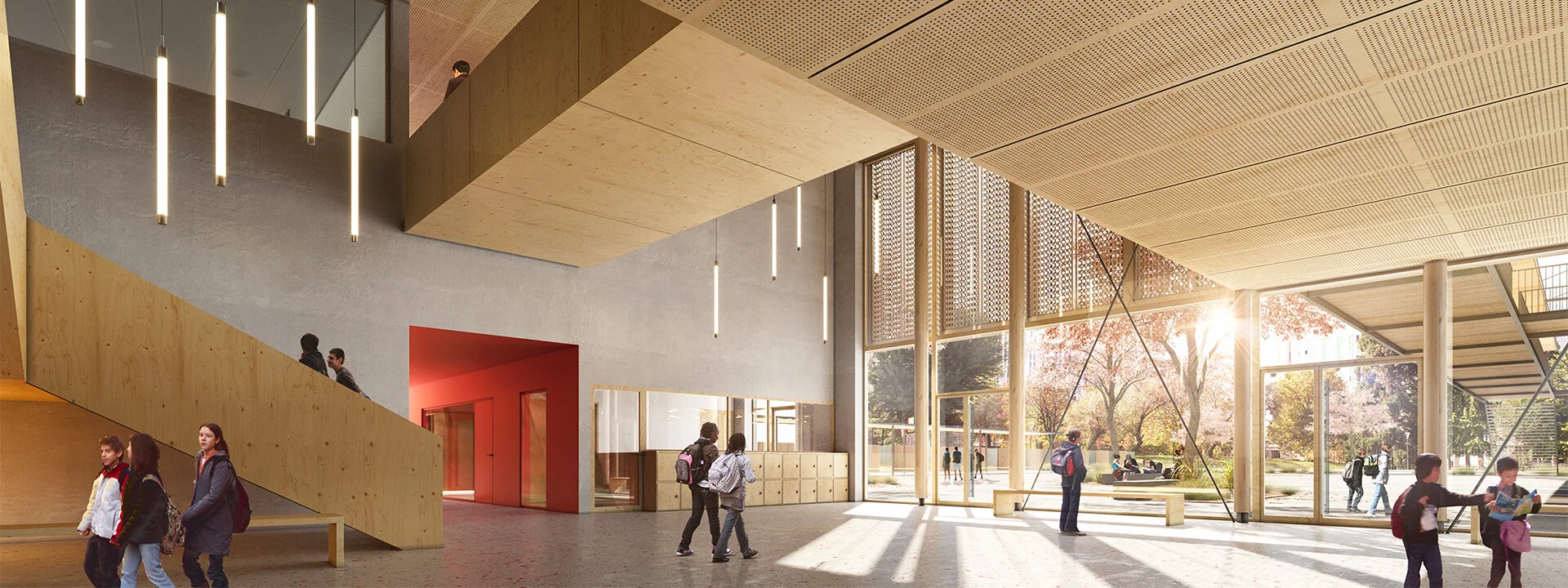 L’affirmation de la trame constituée de profils acier a pour effet de marquer la construction modulaire 3D et d’amplifier vers le haut avec légèreté le volume central par une ramification verticale du maillage que nous voyons sur la perspective depuis la cour. C’est ce volume qui réceptionnera la future extension. Cette trame, c’est aussi celle qu’on peut trouver sur les immeubles de logements proche. Le remplissage entre les mailles du volume le plus haut se fait avec une vêture acier plissée de couleur dorée et chatoyante qui joue avec la lumière. Les surfaces vitrées sont adaptées au besoin d’éclairage naturel des classes. Dans l’ensemble, nos choix de matériaux de façade sont sans entretien, pérennes et durables. L’usage intensif du bois en structure primaire classe notre projet très facilement C1.
