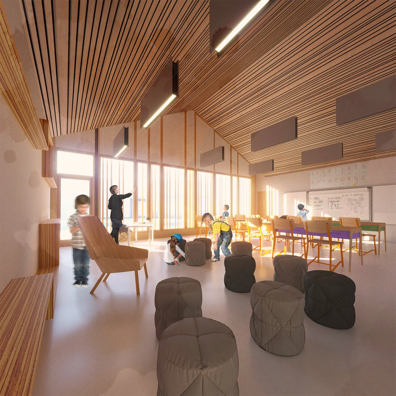 Le deuxième effet est l’usage de grands filtres bois pour les parois transversales Est et Ouest traité comme une tranche prise dans la matière initiale de terre cuite. Ce système active les effets de transparences depuis l’Est vers la profondeur de la cour. Le bois se déroule aussi au rez-de-chaussée sur la façade donnant sur le parvis pour créer l’évènement sur l’entrée par le préau très perméable à la vue, et avoir un équilibre entre terre cuite et bois. Le bois est utilisé comme la composante principale de la structure de l’extension pour ses murs, ses planchers sa charpente et une partie de ses façades. A cela s’ajoutent des isolants naturels pour partie. L’usage à maxima de matériaux biosourcés fait partie de notre culture pour inscrire l’école dans un cadre pédagogique d’éco-responsabilité.