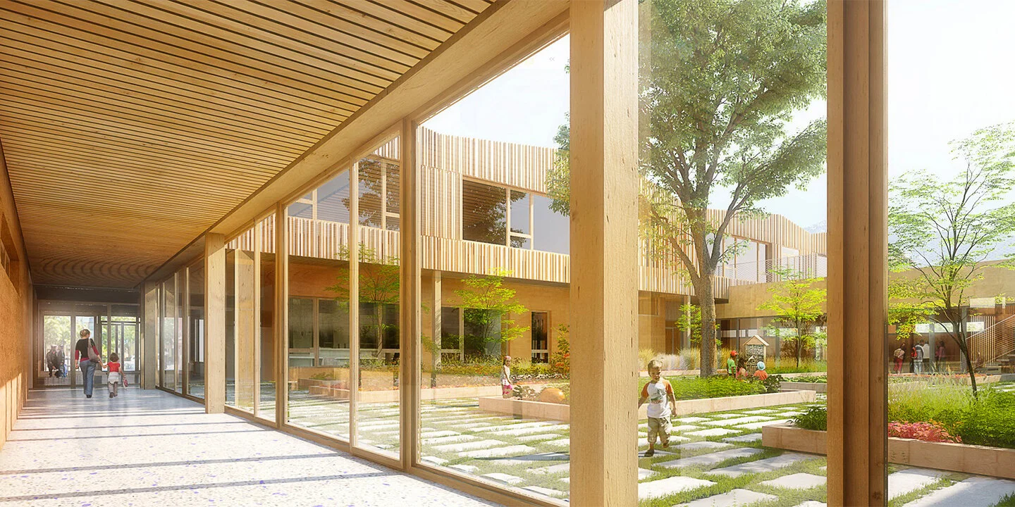 Notre choix de plan masse organise deux cours traversantes, met à distance le projet logements à l’Ouest et crée au centre un jardin pédagogique tel un patio à ciel ouvert où les deux écoles se mirent et conversent. Le paysage est une matière d’architecture qui s’immisce du Nord au Sud dans les cours, dans le patio et sur le toit. Le paysage entre en résonance avec le bâtiment.